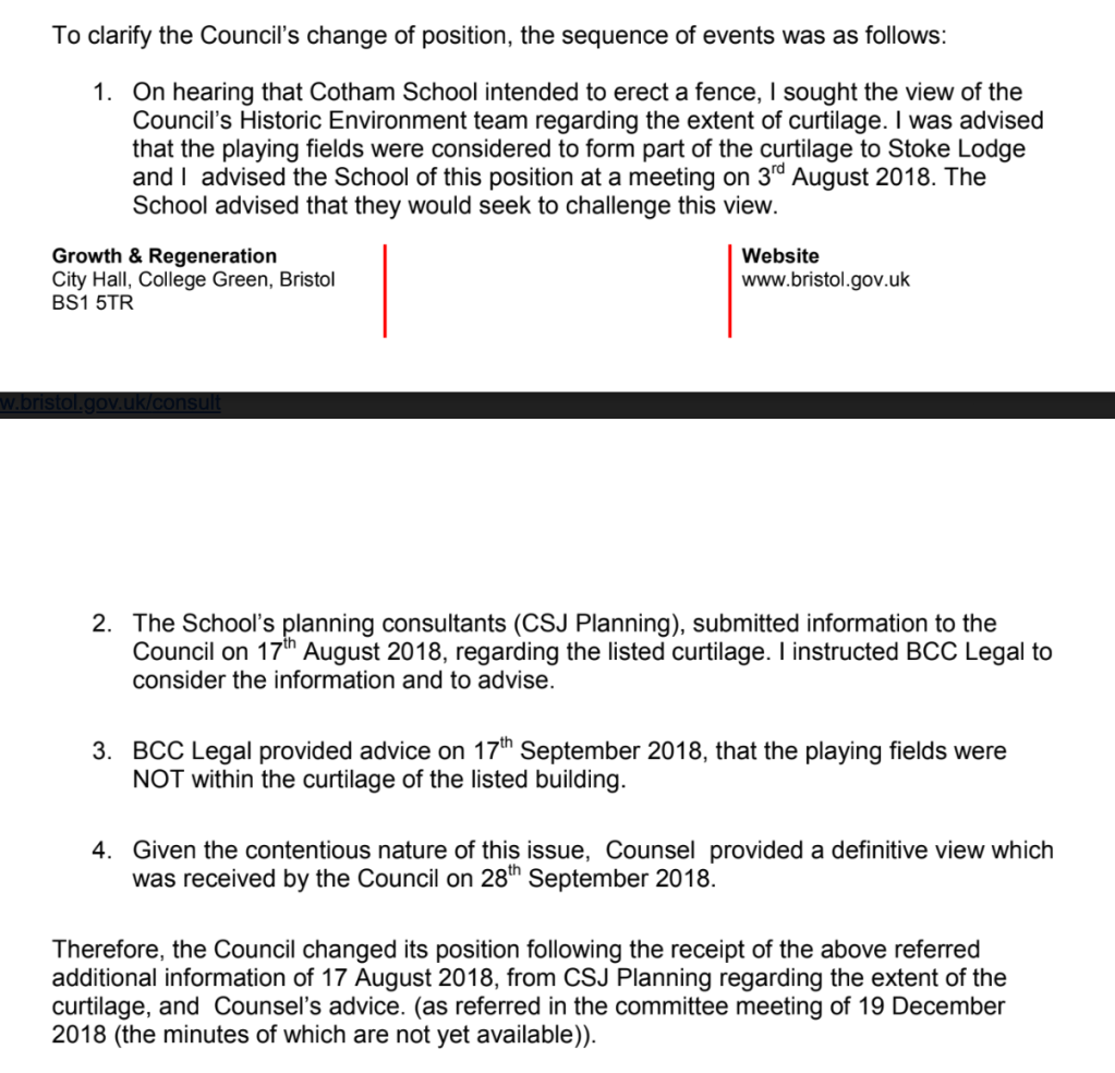 Here’s an interesting thing. We know that Cotham School was told about the Council’s u-turn in their favour on the curtilage issue on 21 September 2018. We’ve seen the email from Gary Collins to Mike Jackson reporting back on that the following week, and there’s plenty of other correspondence from Cotham expressing their satisfaction with the new situation.