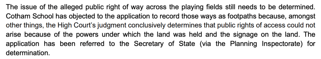 This is just nonsense. The High Court decision was about village green status, and only that. It did not ‘conclusively determine that public rights of access could not arise’ – in fact, the judge specifically noted that the school’s lease is subject to any existing rights of way, whether or not they are recorded. End of.