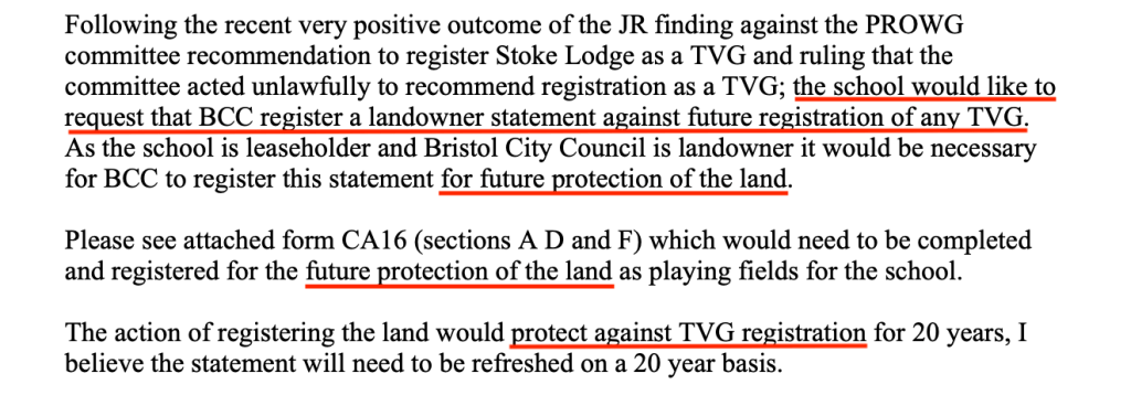Let’s also remember that Cotham took its lease of Stoke Lodge knowing that a TVG application was ongoing, and agreed to a special term that school use was subject to ongoing community use. So unfettered public access shouldn’t be a surprise or indeed a problem for the school – it’s what they signed up for. But it’s understandable, having claimed for so long that TVG status would be a problem, that they want to conduct themselves as though it is.