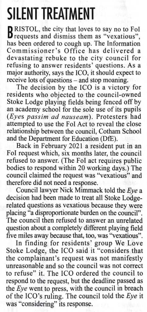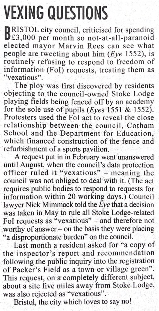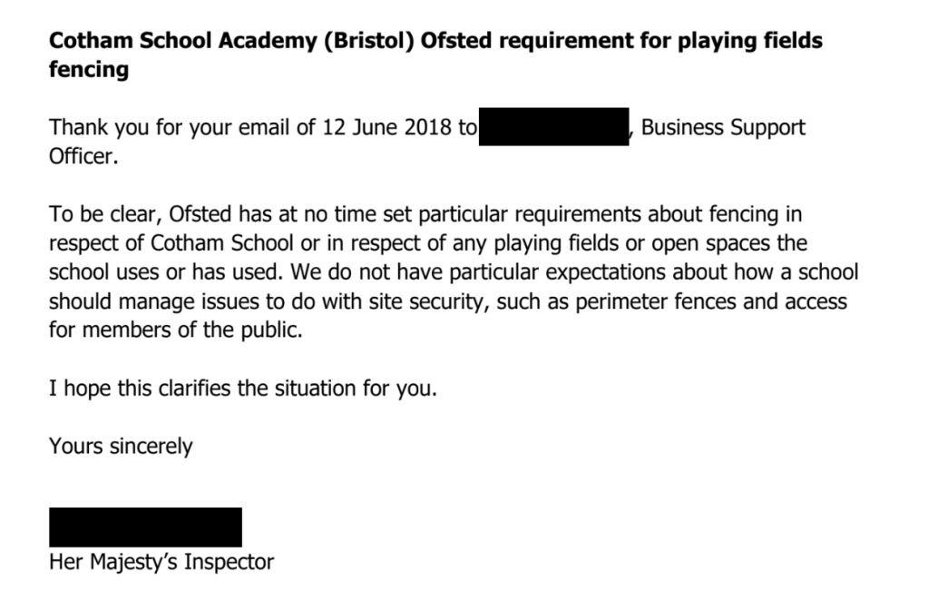 In that letter, Mr Hibberd said that ‘everyone recognises the right of the local community to use the space around the field’. Happy to hear it, but that’s not what the lease says – it says that Cotham School’s right to use (the whole of) Stoke Lodge for PE is ‘subject to all existing rights and use of [the whole of] the Property, including use by the community‘.
