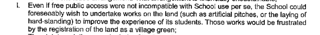 Is this finally the end of the road? Well, registration makes any further application for judicial review pointless, because the fence will have to come down (see below) and judicial review only looks at the process and whether a decision was properly made. If Cotham School went down this road then, even if they were successful in court, the decision would just come back to the Committee to be taken again – but the fence would no longer be there anyway. Only a court can now amend the register entry, if it considers it to be incorrect and deems it just to rectify the register. Any such court application would be expensive, risky and hard for Cotham School to justify making, since TVG status makes no difference to its ability to continue to use the land for PE (in the same way that it has done since 2000).