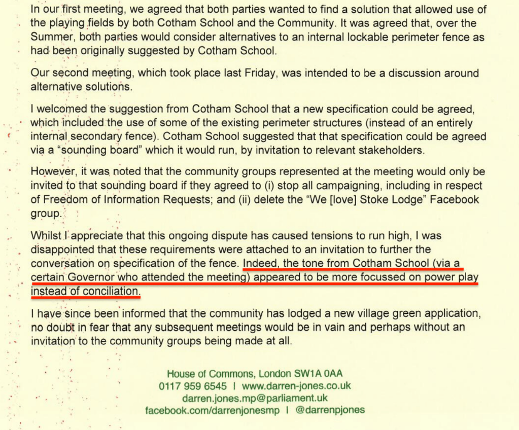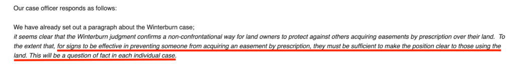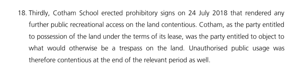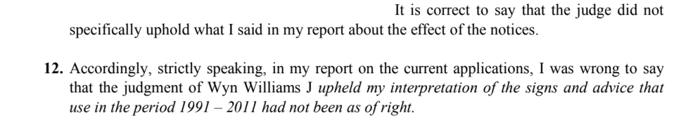 Secondly, he refused to consider whether all the evidence of inconsistent conduct by the Council and the School indicated acquiescence, because he said the signs overrode all that. But the Winterburn case is very clear that the landowner must ‘object and continue to object’. The Inspector agrees with us that Avon wasn’t objecting to use at any time after January 1990. So whether he’s wrong on Winterburn really matters, as he himself now admits.