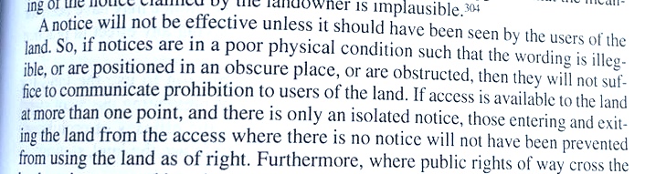 That’s really important: ‘A notice will not be effective unless it should have been seen by the users of the land… If access is available to the land at more than one point, and there is only an isolated notice [Ed: or two!], those entering and exiting the land from the access where there is no notice will not have been prevented from using the land as of right.’
