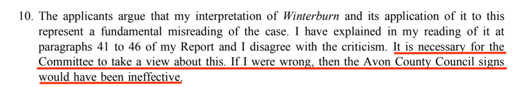 The third thing that the Inspector refused to consider was whether two signs were enough, on a 23 acre field with multiple access points and residential gates, to make any objection clear. He said he saw no basis for considering that issue, even though it was the exact reason why the Committee disagreed with him in 2016, and the Council spent the next two years arguing before the High Court that there weren’t enough signs. Why did he blinker himself like that?
